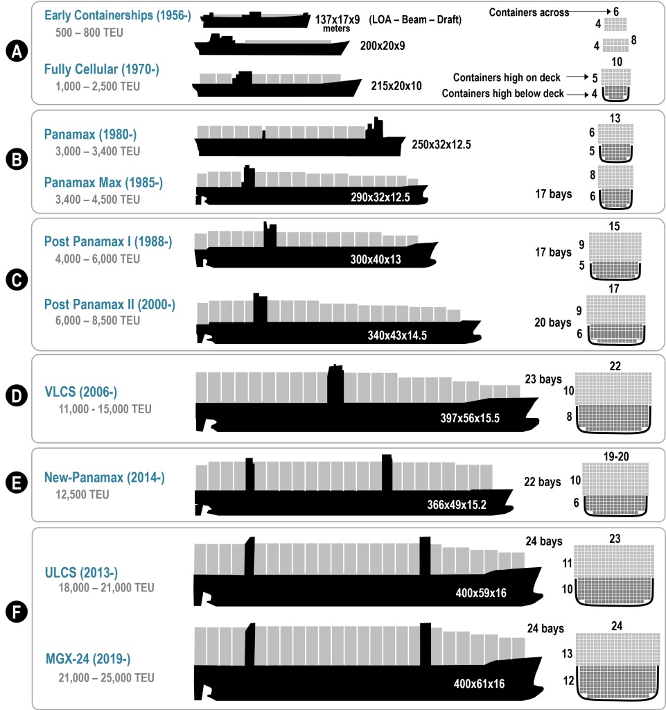 Today’s topic is a fascinating dive into a world of global trade; research has shown that around 90% of international trade is carried by shipping containers, and the World Bank statistics show that in 2019, nearly 800 million were shipped annually; given the increase over the past few years in online shopping, I can imagine that figure is by now significantly higher. The unit used for measuring how much a ship can carry is TEU (Twenty-foot Equivalent Unit); the chart below shows the adaptation of ship sizes over the years, driven by global trade: